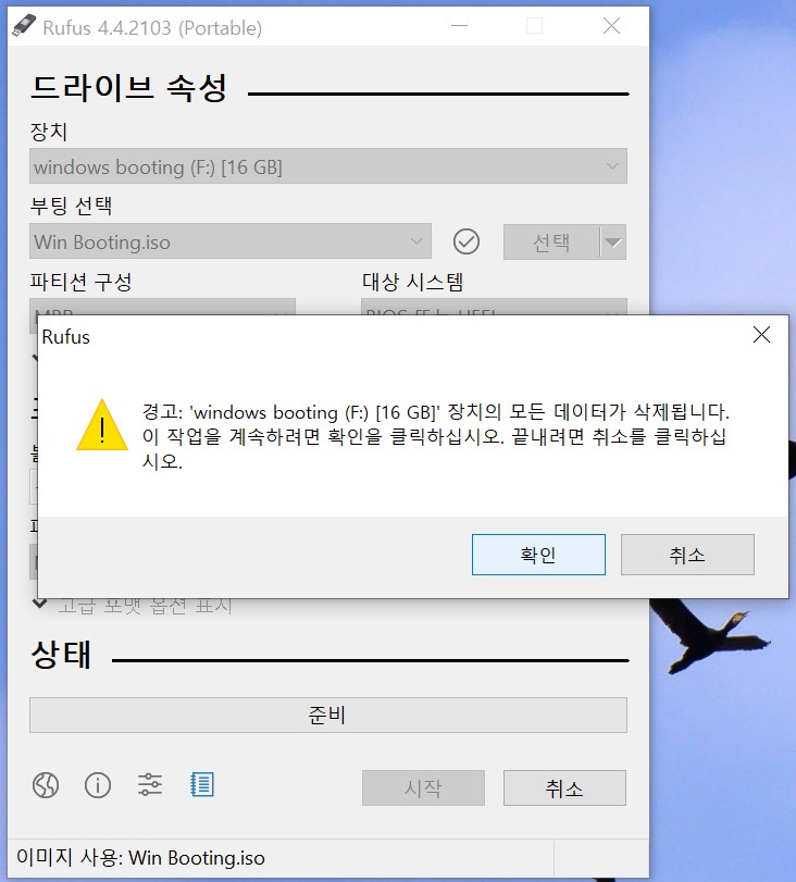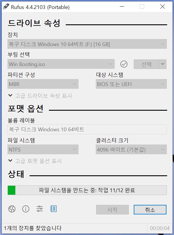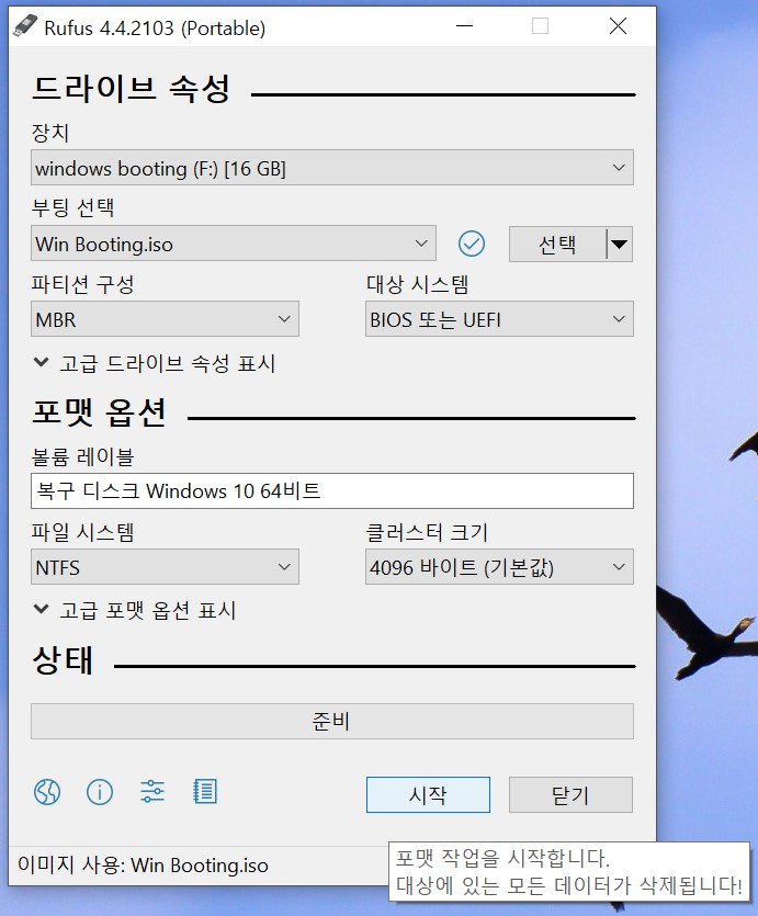 시스템 복구 디스크 이미지 USB에 굽기(Rufus 4 사용)----------------------------------------------------------