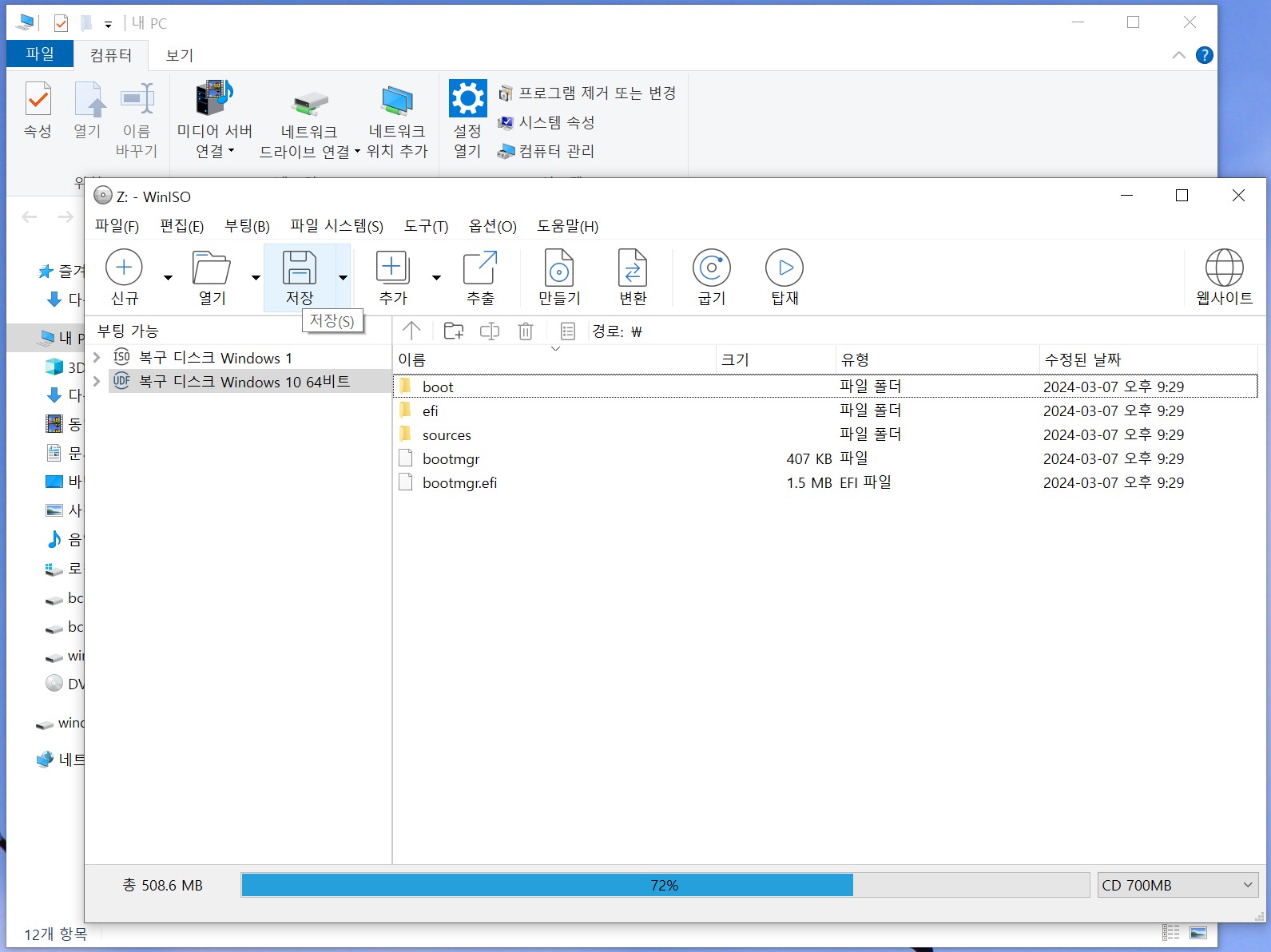 다되면 WinISO 종료 - 시스템 복구 디스크 이미지 만들기 완료