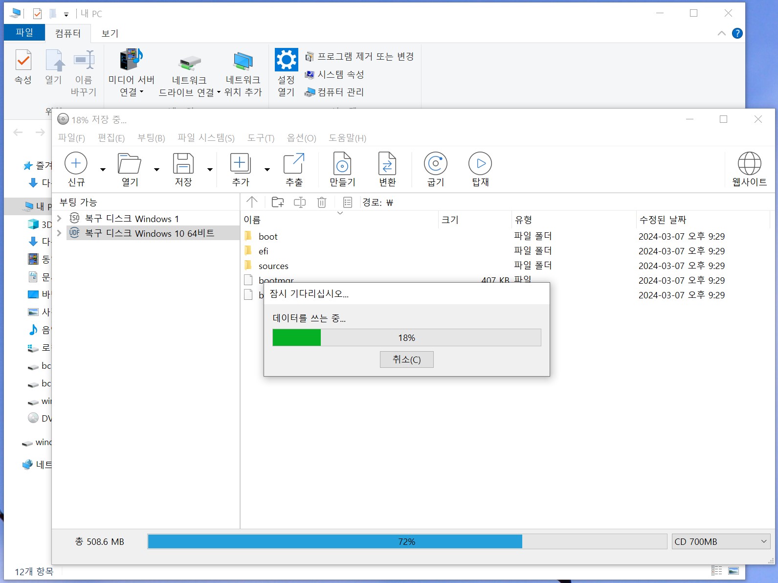 CD/DVD RW에 공CD를 넣고 [ 디스크 만들기(R) ]선택