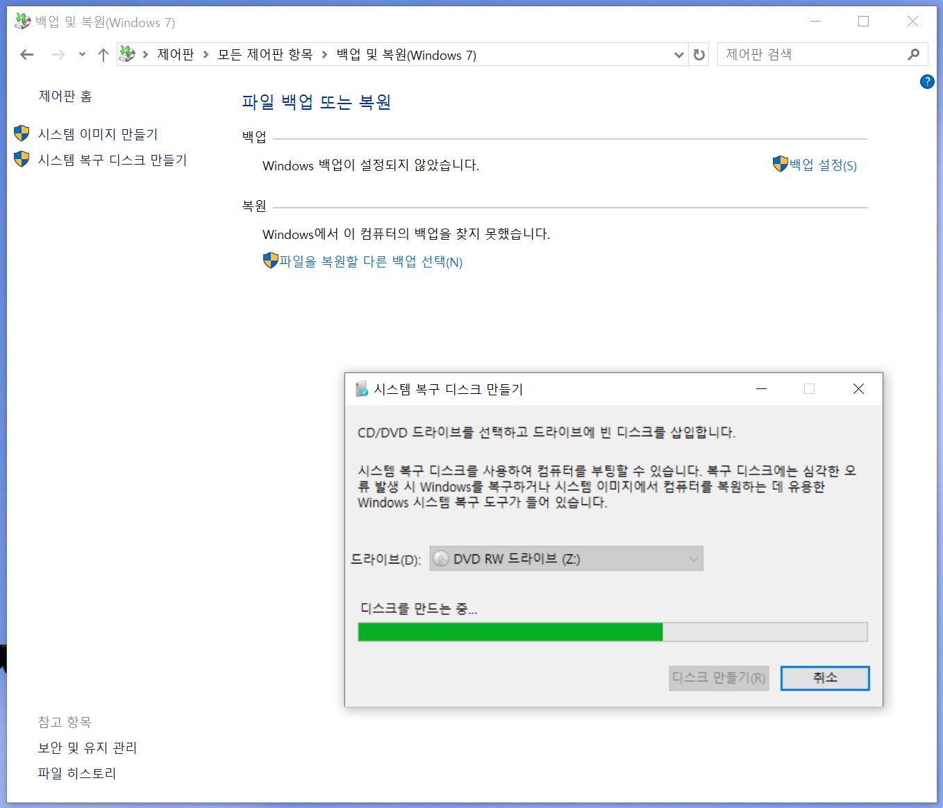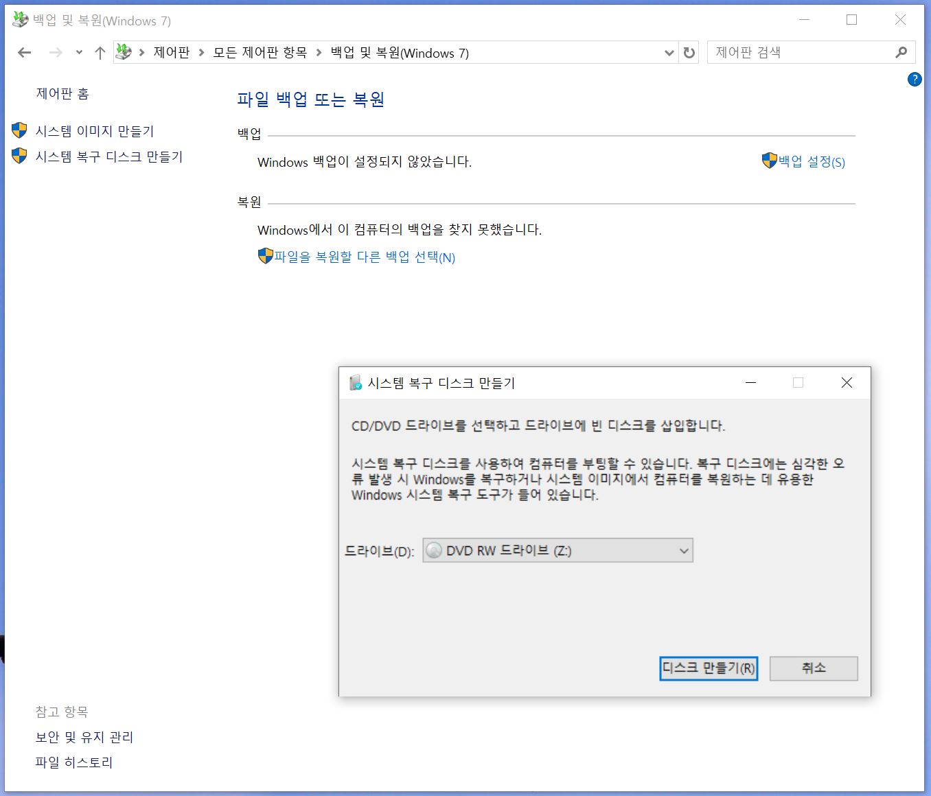 시스템 복구 디스크 만들기-----------------------------------------------------------------------------------------