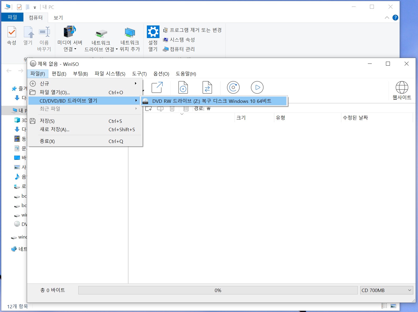 [ 파일 > CD/DVD/BD 드라이브 열기 > DVD RW 드라이브 ] 선택