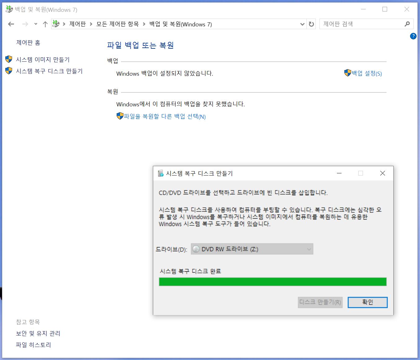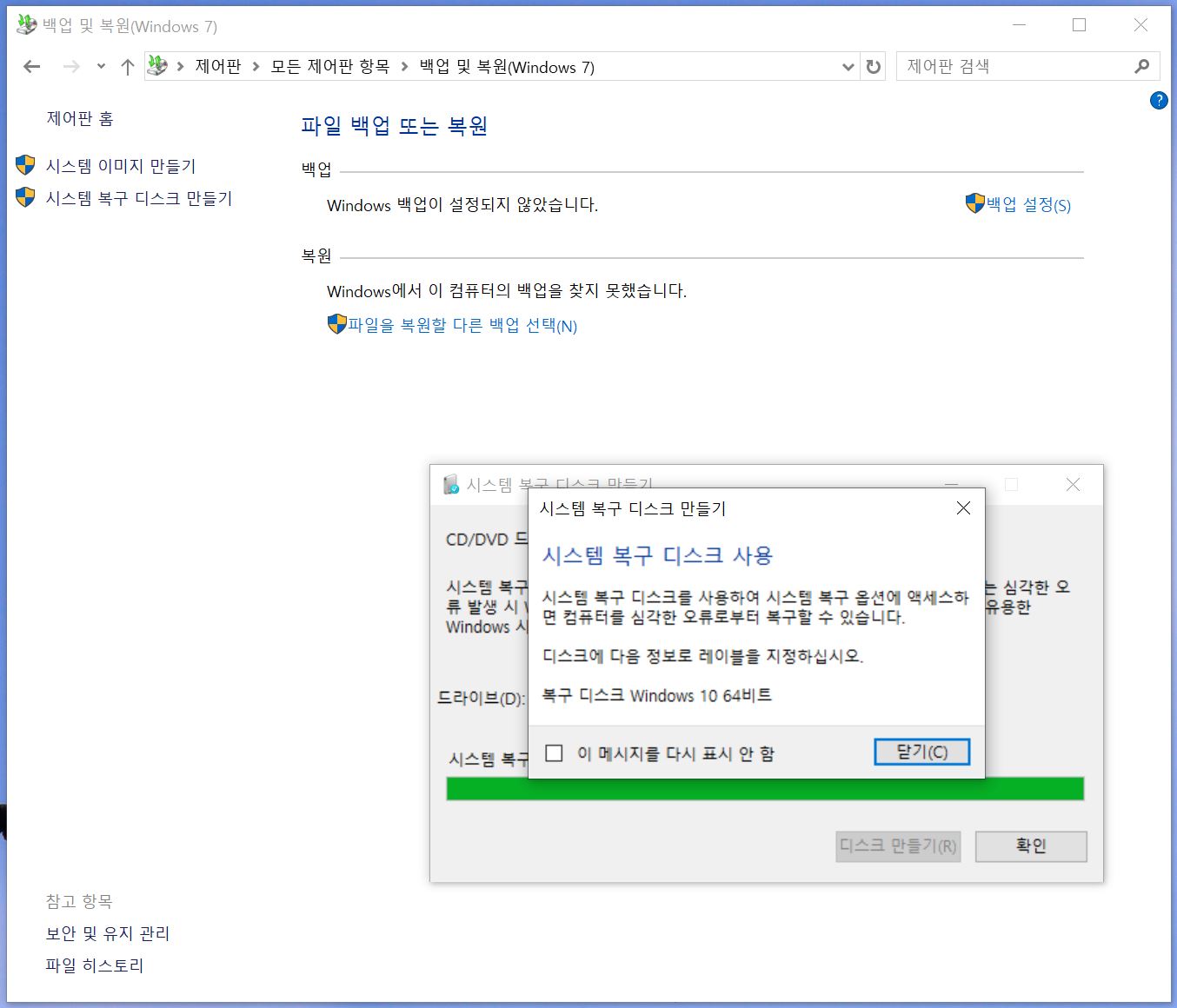 시스템 복구 디스크 만들기 완료